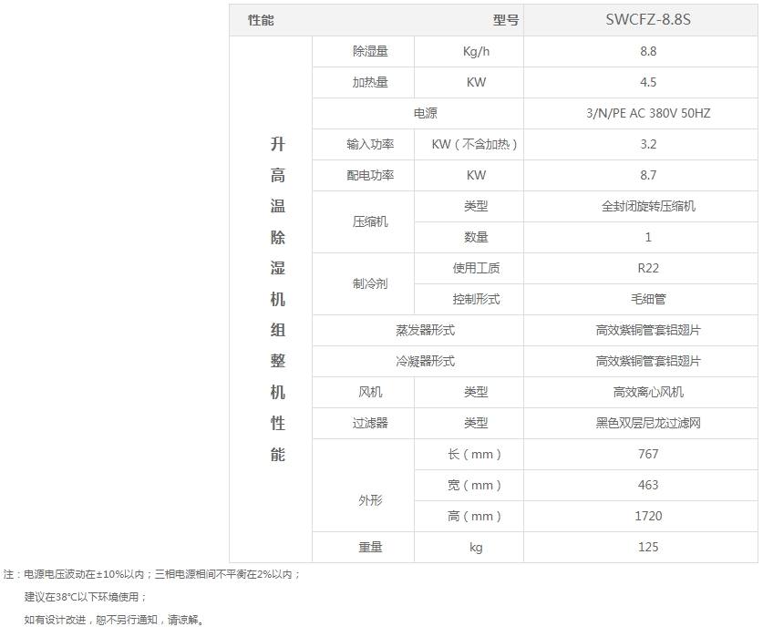 升高溫除濕機的除濕原理是利用未飽和濕空氣吹過被烘干的物料,吸收其中水分的設(shè)備。為提高濕空氣的吸濕能力,一般都是先將空氣加熱,設(shè)備使?jié)窨諝舛▔合峦ㄟ^加熱器時,外界加熱濕空氣,濕空氣溫度升高。但并未增加濕空氣的水蒸氣含量,也無蒸汽凝結(jié)析出,因而相對濕度下降為為之下降,所以提高了吸濕能力。